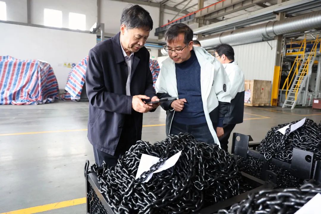 雙鳥集團張文忠董事長、盛嘉慶總經理陪同王會長一行參觀了雙鳥機械總裝車間、起重鏈條制造車間。