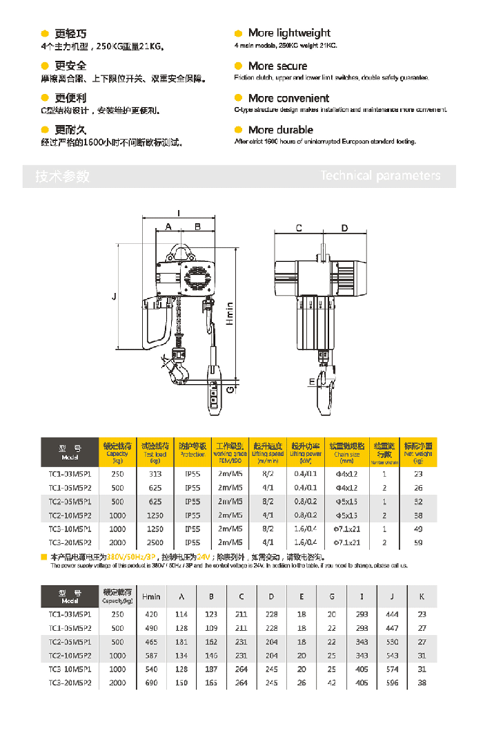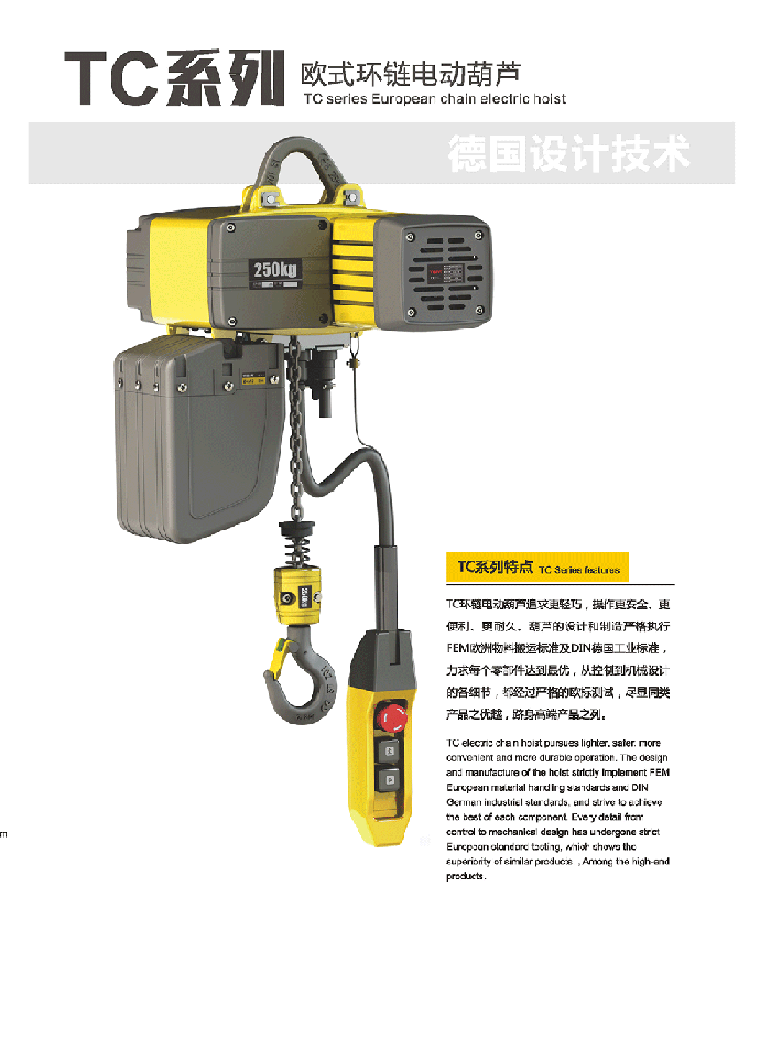 雙速起升速度為標準配置,備有吊鉤式與吊耳式兩款懸掛方式,也可直接與電動小車吊銷連接,使其連接更為完美。